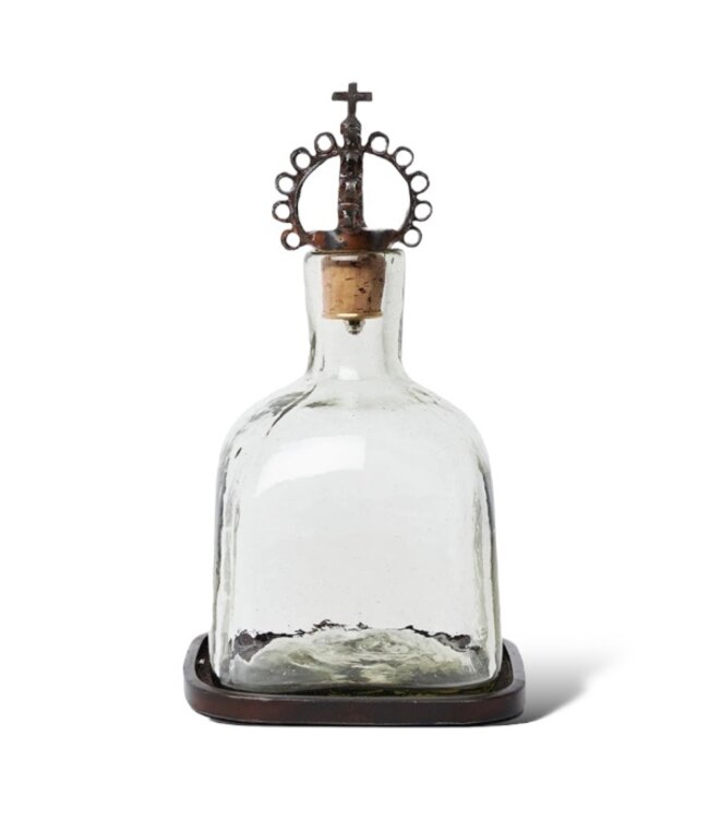 Mouth blown decanter resting in a wax cast tray, topped with a jubilant, pear-shaped corona de hierro . . . Read more.