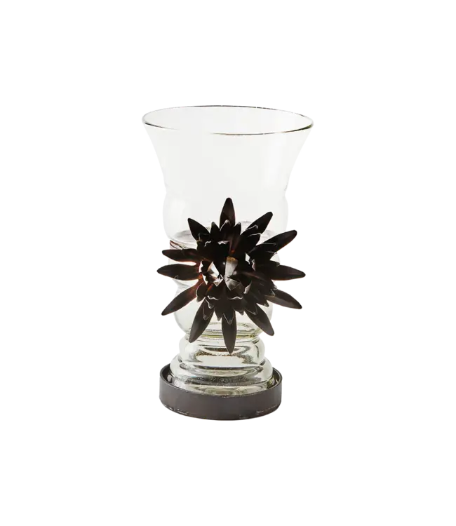Mouth blown ribbed glass vase with large iron sunflower tied with leather. Rests atop an iron coaster