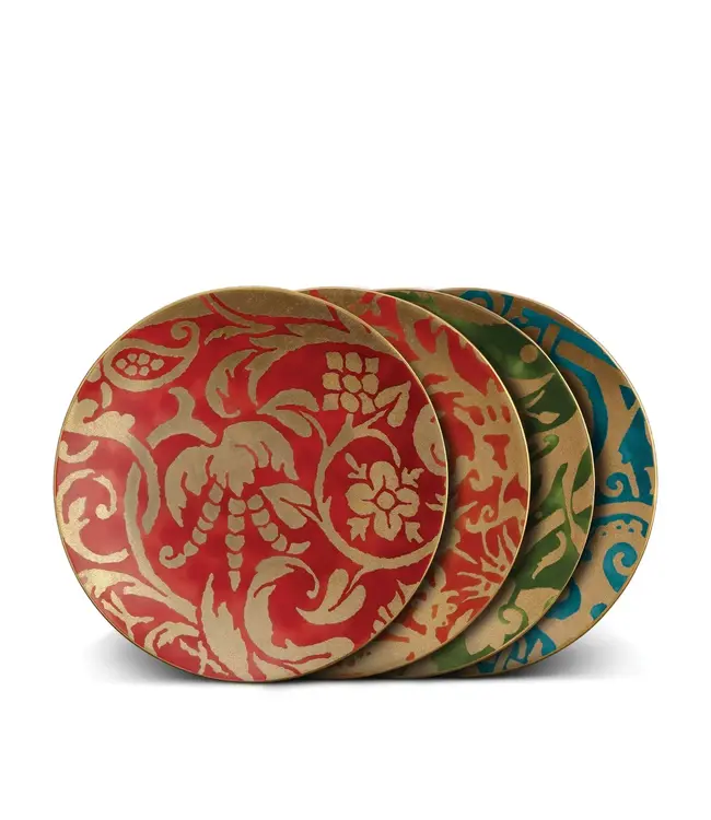 The artisans of Venice inspire this sumptuous tapestry of invention and delight, woven throughout everyday experiences. This vibrant set of 4 dessert plates includes a prismatic assortment of designs on earthenware with hand-gilded 24K gold accents.