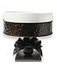 Creamy white 13" diameter bowl resting in a signature hammered iron vessel with Guadalupe rose foot, an exquisite serving piece or vessel for potted plants.