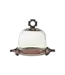 Mouth blown glass cake dome with a magnifying wood cross top resting on a beautiful hammered iron plate with curved handles.
