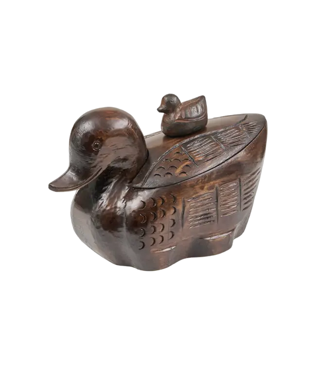 Handsome hand carved wooden duck box with cast iron baby duck on top of wood lid … a true collector's item Read more.