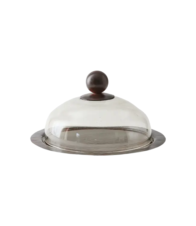 Mouth blown glass dome with balin top resting on a hammered iron round platter