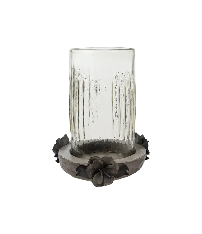 Cast stone encircled with forged petals and rosas en gris . . . large mouth blown ribbed vessel for branches, statement florals, or pillars of varying heights . . . Read more.