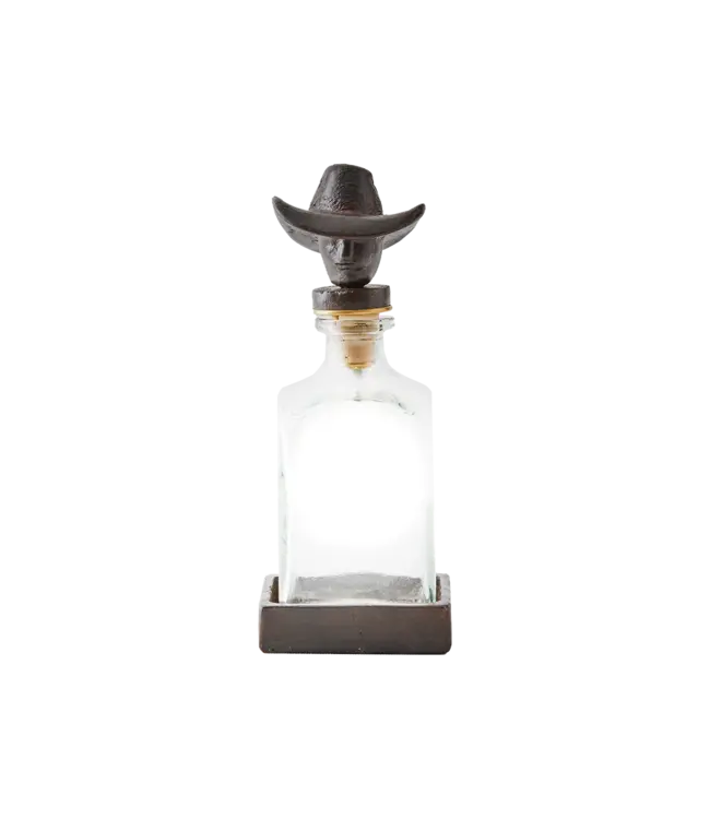Cowboy wax cast iron decanter topper with vintage style glass bottle and iron coaster.
